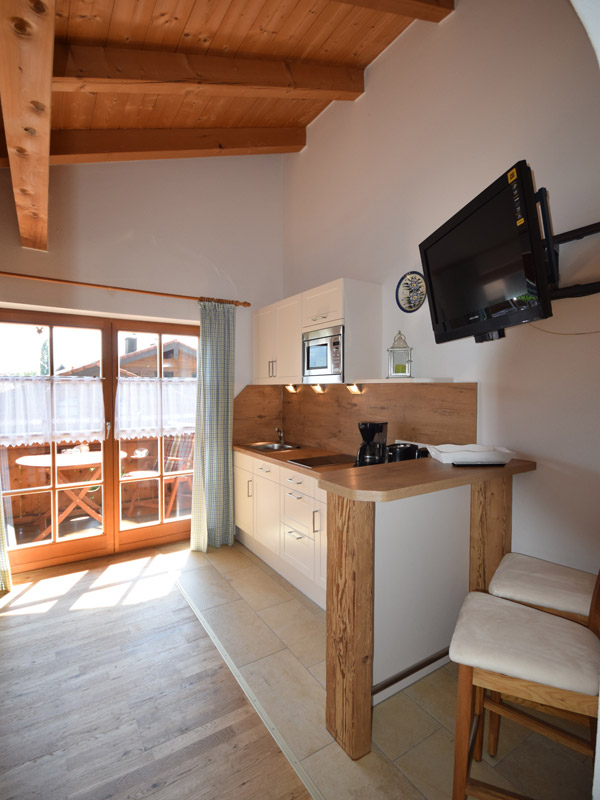 Die Ferienwohnung Hochgern verfügt über ein Schlafzimmer mit Doppelbett und ein getrenntes Wohnzimmer mit Schlafcouch. Die Küchenzeile ist mit einer Mikrowelle ausgestattet. Vom Wohnzimmer aus gelangen Sie auf den Balkon mit Bergblick.